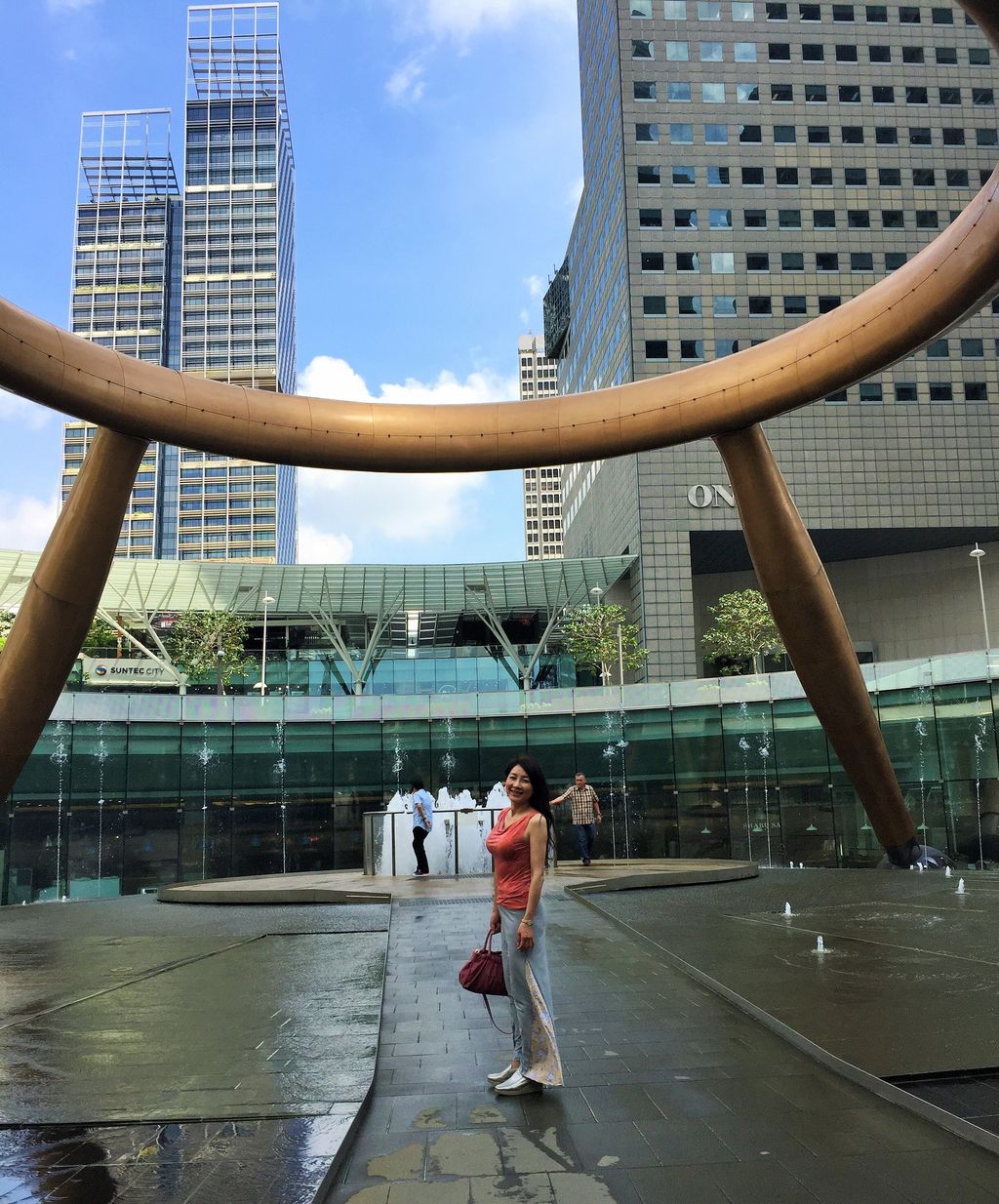 右手で噴水に触りながら
